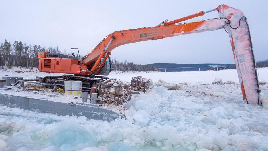 100-150 mm ice layer instantly completely covers the working equipment as soon as the bucket has been raised from the water. Machines, hydraulics, lubricants and, of course, metal structures work here at the limit of their capabilities, and sometimes even beyond. But despite this people, equipment and tools do not stop in their movement towards their goal, in the performance of their mission.