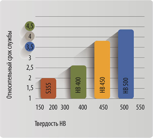 HARDOX 450 — износостойкая сталь (твердость 425-475 HB), применяется при изготовлении режущих кромок, бокорезов, защитных накладок на боковины и дно ковша. Как правило, стали данной марки используются при производстве усиленных и скальных ковшей.